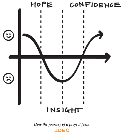 While this particular workshop a few weeks back was about project planning, it also applies to how we approach our careers. On the screen I had one of my favorite graphics, from design thinking firm Ideo, on how the journey of a project feels.