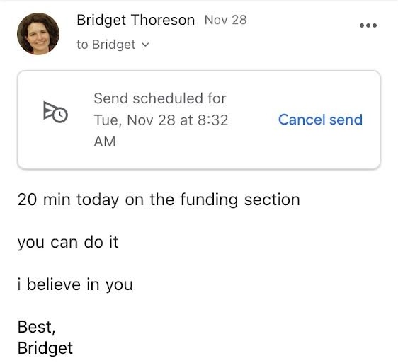 I think of it as being kind to my future self — if I can make some progress now, that means I’ll be in a better position later.