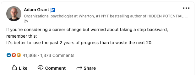 When we think about it this way, it’s obvious that we’re better off backing up. But when we’re committed to the career ladder approach, taking a step back is seen as a loss. We worry about how it will look on our resume for future employers. We blame ourselves for not pushing ahead, even though there may be factors outside our control, or maybe we’re just not interested in the role on the next ladder rung.